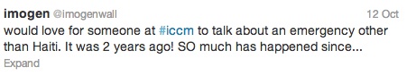 I want to focus on the second reason for why this tweet got my attention. I’ve been taking a refresher course in my Ph.D. program on experimental design, and I found myself both excited and concerned by the content of the tweet. While we have to be keeping the new projects and events at the forefront, those of us in the political science departments of the world (like me) have to revisit the details of events from Haiti and make sure we continue to try to identify comparative variables across cases. What were the key variables in the Haitian earthquake information environment that we can proxy across cases since 2010 and test statistically and qualitatively? When we do this testing, do we see positive changes? Any changes at all? This kind of data analysis can help the tech community in their work designing the exciting mapping and data tools featured at ICCM.